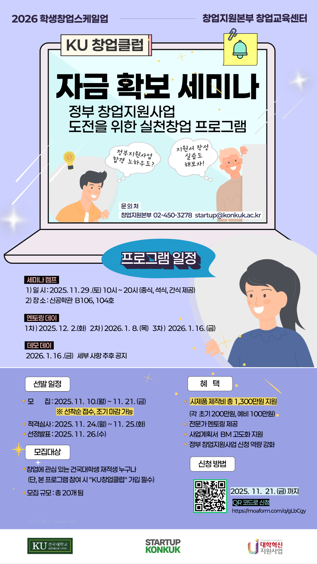 실전 창업 프로그램 "KU 창업클럽 자금 확보 세미나" 참가자를 모집합니다.