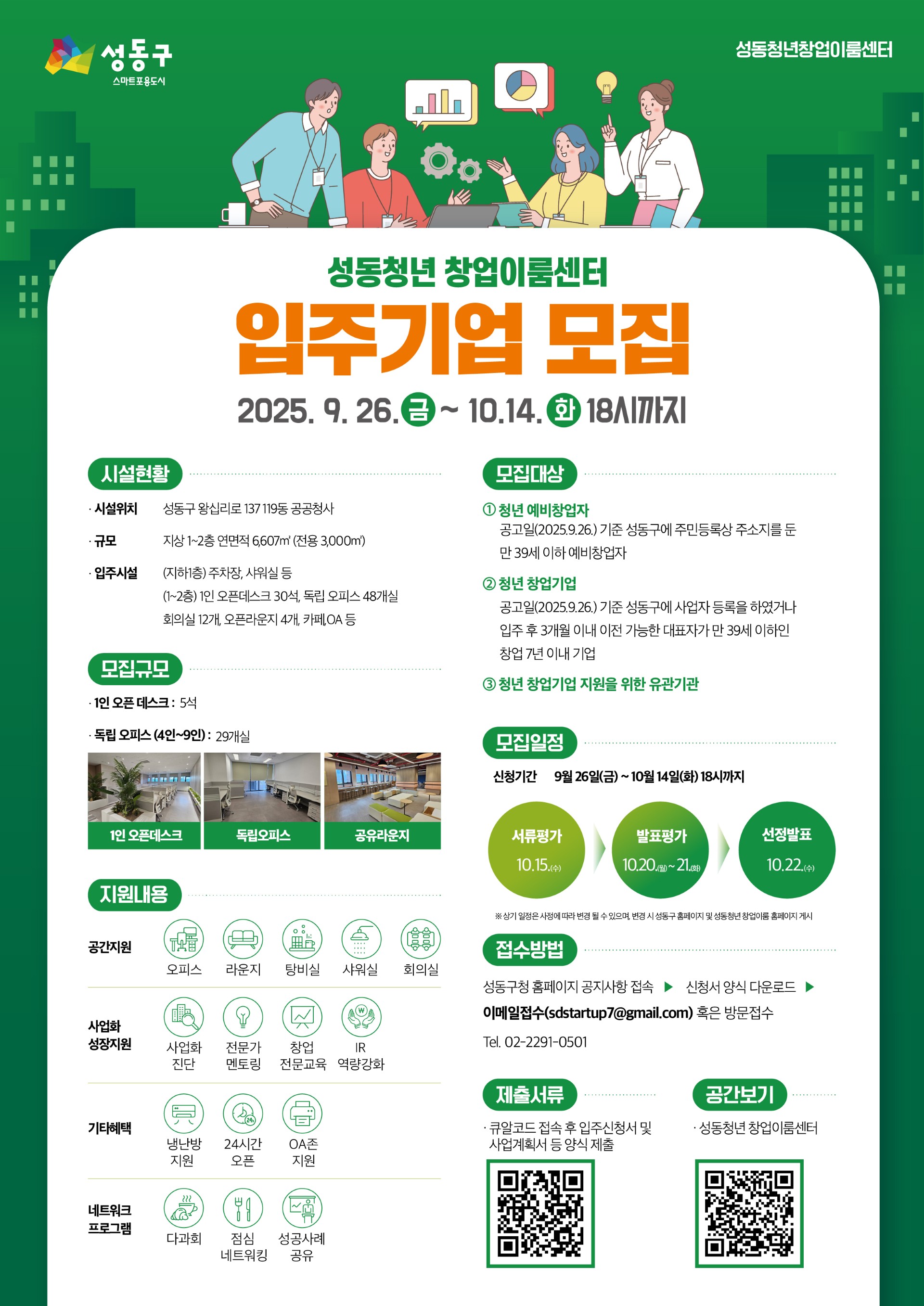 청년 창업, 성동에서 시작하세요!성동청년 창업이룸센터가 혁신 아이디어와 열정을 가진 청년 창업자를 모집합니다. 자부담 없는 창업공간 제공 (1인 사무실 부터 4~9인실의 독립 사무실까지) 창업보육 프로그램, 네트워킹, 전문가 멘토링 지원 IR 역량 강화 교육 및 성공사례 공유 프로그램 운영 안정적인 공간과 맞춤형 지원을 통해 청년 창업자의 성장을 돕고자 하오니, 많은 관심과 지원 바랍니다. ▶ 신청기간: 2025. 9. 26.(금) ~ 10. 14.(화) 18:00까지 ▶ 접수방법: 성동구청 홈페이지 공지사항 확인 후 신청서 제출 ▶ 지원 대상 만 39세 이하 예비창업자 (공고일 ('25. 9. 26.) 기준 성동구 거주자) 창업 7년 이내 청년 창업기업 (성동구 내 사업자 등록 또는 입주 후 이전 가능) 창업유관기관 ▶ 입주 모집 내용 - 소 재 지: 서울 성동구 왕십리로 137(서울숲아이파크리버포레1차 119동 공공청사) - 입 주 기 간: 6개월~3년(연장 심사 통과 시) - 1인 오픈 데스크: 최초 6개월, 6개월 단위로 최대 3년 · 4인 이상 독립 오피스: 최초 1년 계약, 1년 단위 최대 3년(연장심사) - 규 모: 지하1층 ~ 지상2층(6,607, 전용 3,000㎡) - 월 사용료: 1인당 20만원 ~ 24만원(부가세 별도) · 1인 고정 데스크 5개 / 20만원 · 4인~9인 독립오피스 29개 / 24만 원 / 인 ※ 상세 내용 첨부파일 참고 ▶ 모집 분야 온라인셀러형, 로컬크리에이터형, 라이프스타일형 ▶ 지원 내용 사업화 지원금 최대 4천만원(정부지원금 100%, 자부담 없음) 체계적인 창업 지원 프로그램을 통한 사업화 과정 밀착 관리 정부자금, 유사 사업 등 후속 연계 및 보육 공간 지원 ▶ 접수 방법 온라인 신청 (https://url.kr/nq7smc) 자세한 사항은 신사업창업사관학교 홈페이지를 참고해주세요.